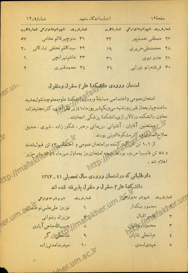 امتحان ورودی, دانشکده معقول و منقول, اسامی پذیرفته شدگان